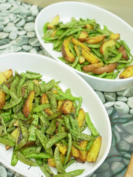 新じゃがとキヌサヤのソテー 新茶塩の風味