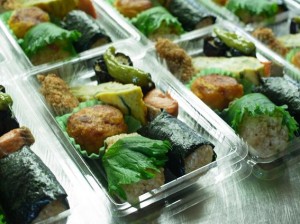お弁当!! 2種の玄米にぎり・南瓜のモチモチ焼き・ズッキーニオムレツ・ナスの黒ゴマ味噌田楽・いわしのフライ梅大葉風味・時鮭