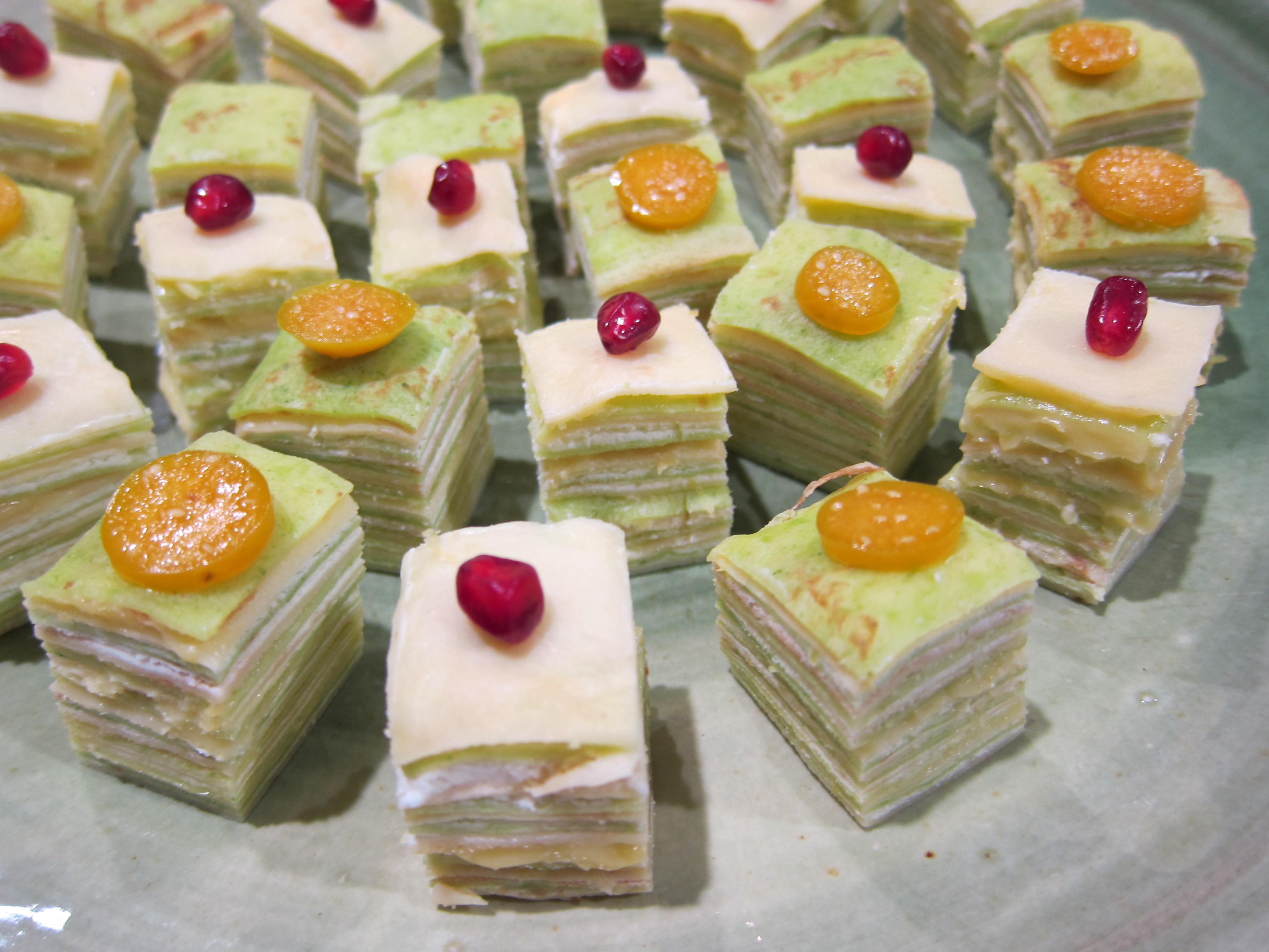 セロリの甘酒ミルクレープ レモンカードとヨーグルトクリームの2層仕立て ホウズキとザクロを添えて