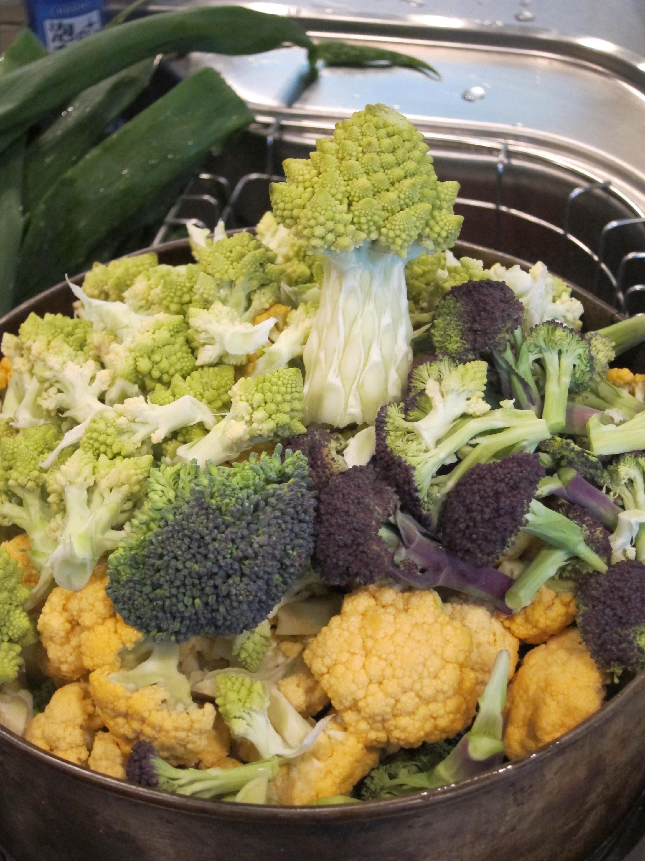 これからホロッホー蒸しになるカラフルなカリフラワーたち…てっぺんはロマネスコ!