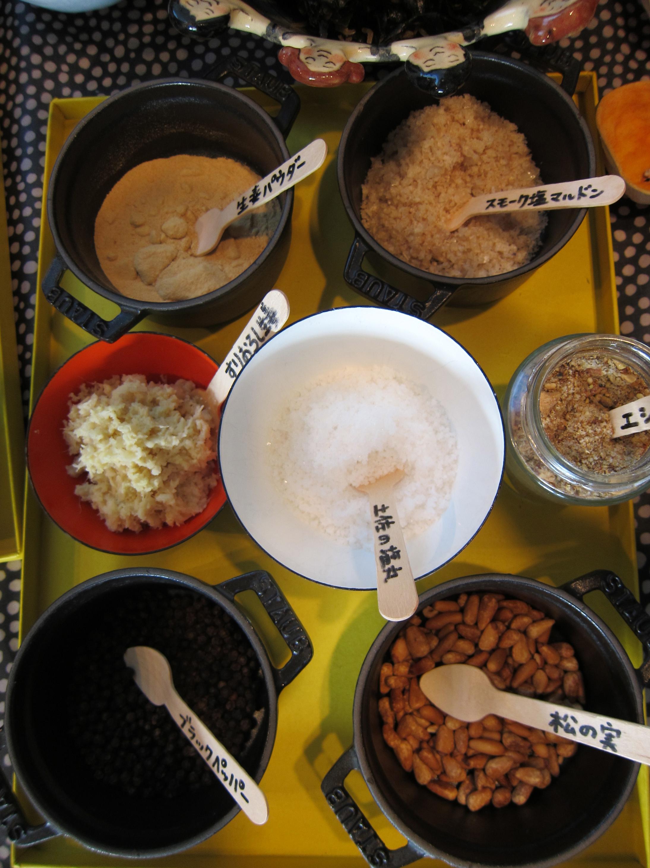 お粥のトッピングいろいろ…スモーク塩マルドン、エジプト塩、松の実、ブラックペッパー、すりおろし生姜、生姜パウダー、土佐の塩丸