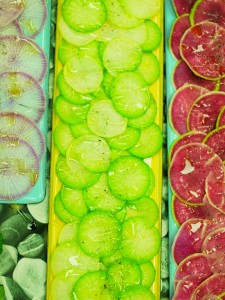 左から、紅しぐれ大根、ビタミン大根、紅心大根