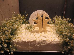 白いベースに、星と月の大きなモチーフをのせ、周りには沢山のカモミールをあしらったケーキをお届けしました。
