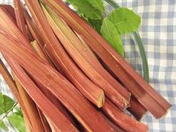 ルバーブシュトロイセルは、日本ではあまり見かけないルバーブという植物(写真の赤い植物がルバーブです。)を使った、熱々のあまずっぱいお菓子