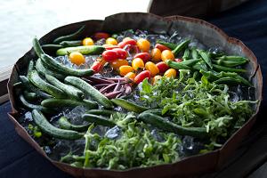 氷の上に並ぶ新鮮なお野菜、3種の塩で