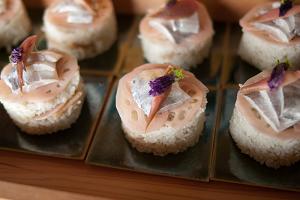 三色の色合いとお皿とのコントラストが美しい押し寿司